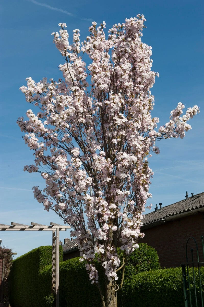 - Perfect for small gardens, this white-flowering cherry blossom has an upright form that fans out slightly in maturity